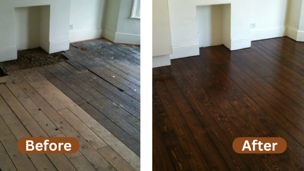 See the difference professional Floor Sanding in London can make. This real before-and-after transformation shows how worn, scratched, and dull wooden floors can be restored to a smooth, clean, and polished finish using expert sanding and refinishing techniques.