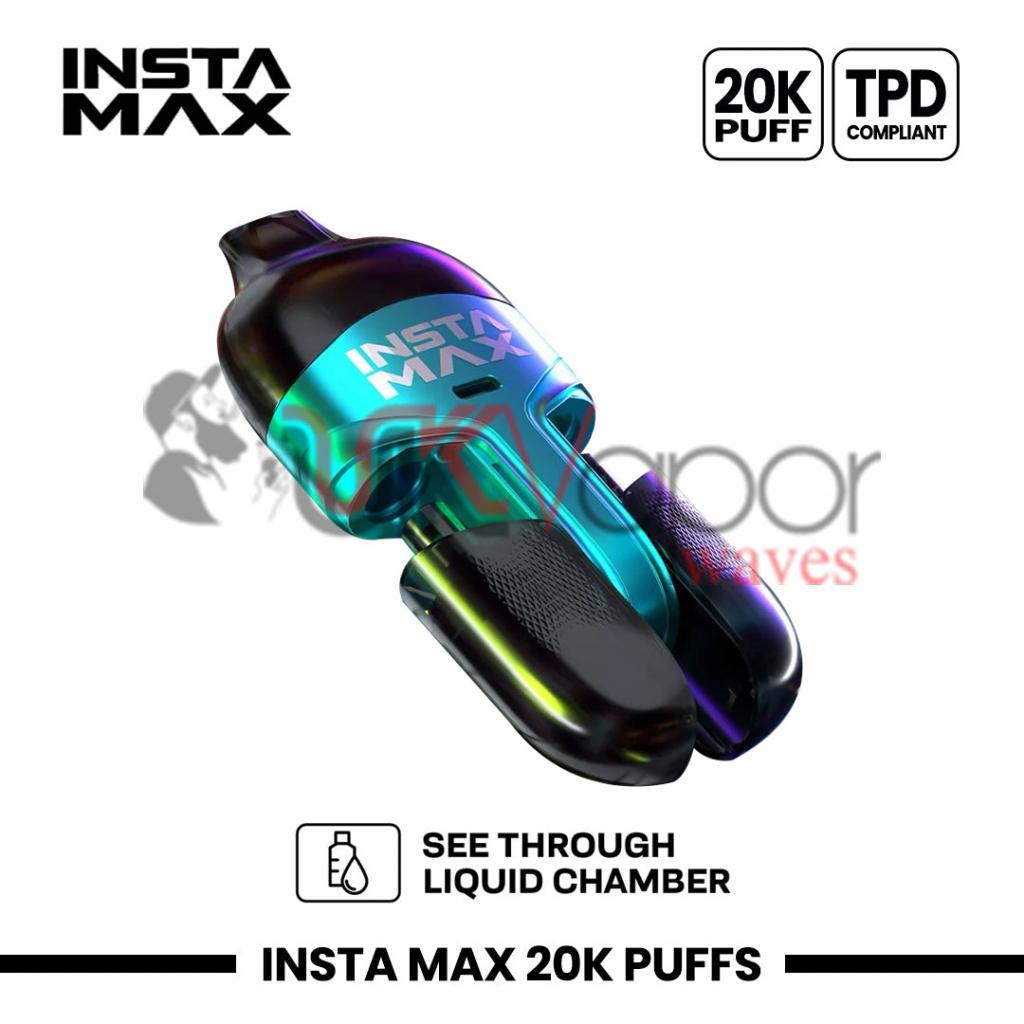 The Insta Max 20000 Puffs delivers up to 20,000 puffs with a rechargeable 550mAh battery and USB Type-C charging. It features two 10ml e-liquid pods and smooth vapour from its mesh coils. Switching flavours is easy—just double-click the button.