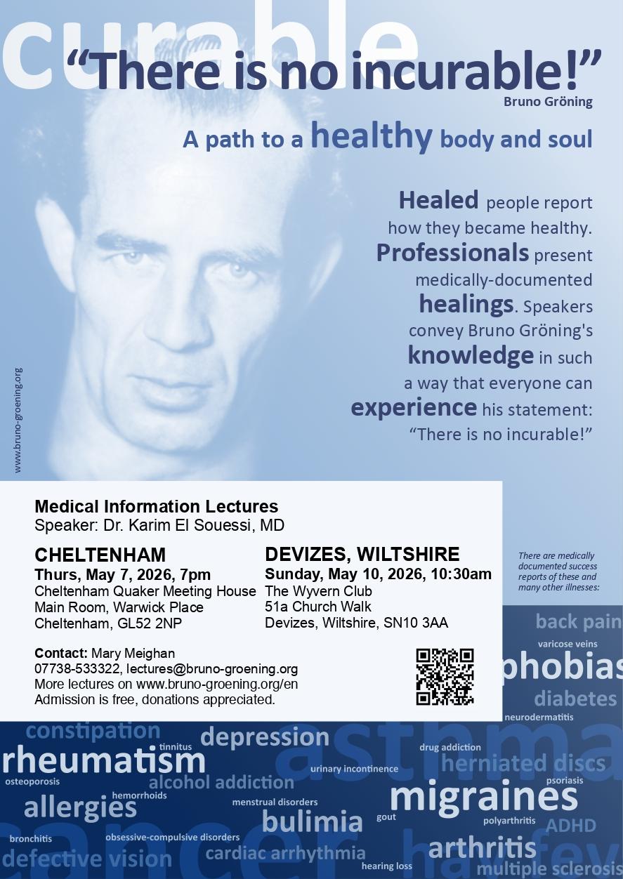As part of a medical lecture series by the Bruno Groening Circle of Friends, a medical lecture will take place in Cheltenham.