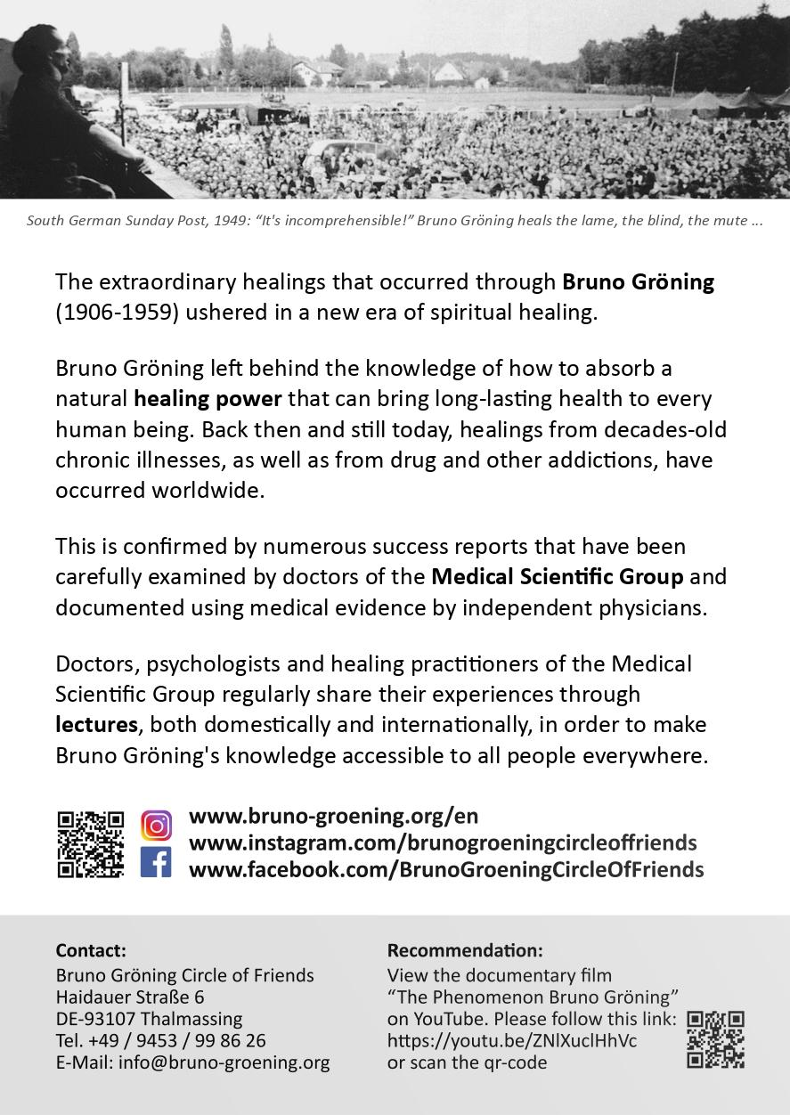 At this special information lecture, a licensed medical doctor from Germany will speak about remarkable personal reports of recovery and renewed vitality that individuals have experienced after engaging with the Teaching of Bruno Groening (1906–1959). These experiences have been observed and documented by the Medical Scientific Group (MWF) of the Bruno Groening Circle of Friends. The MWF is a group made up of medical doctors that verify the success reports submitted by people that have experienced an improvement of their physical or medical conditions after applying the principles taught in the Circle.