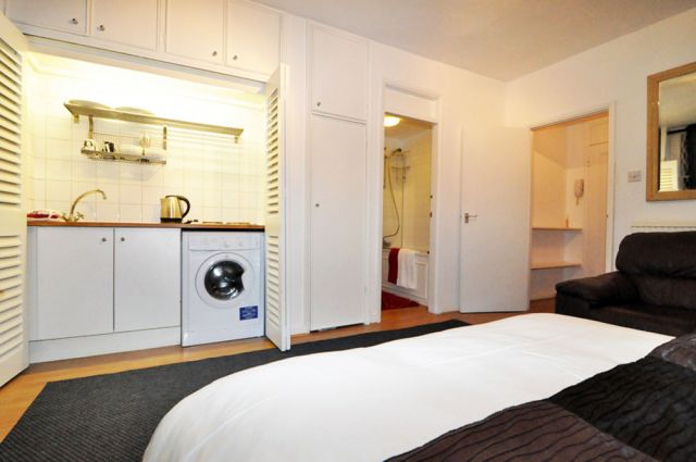 A magnificent pied-à-terre in the prestigious location of Knightsbridge, opposite Harrods. This newly refurbished self-contained studio flat occupies a portered block on Basil Street. The property features a well-equipped kitchen, stylish bathroom, built-in wardrobes and ample storage space. The generous studio space contains a king-sized bed, twin sofa and marble table. The price includes central heating and hot water.