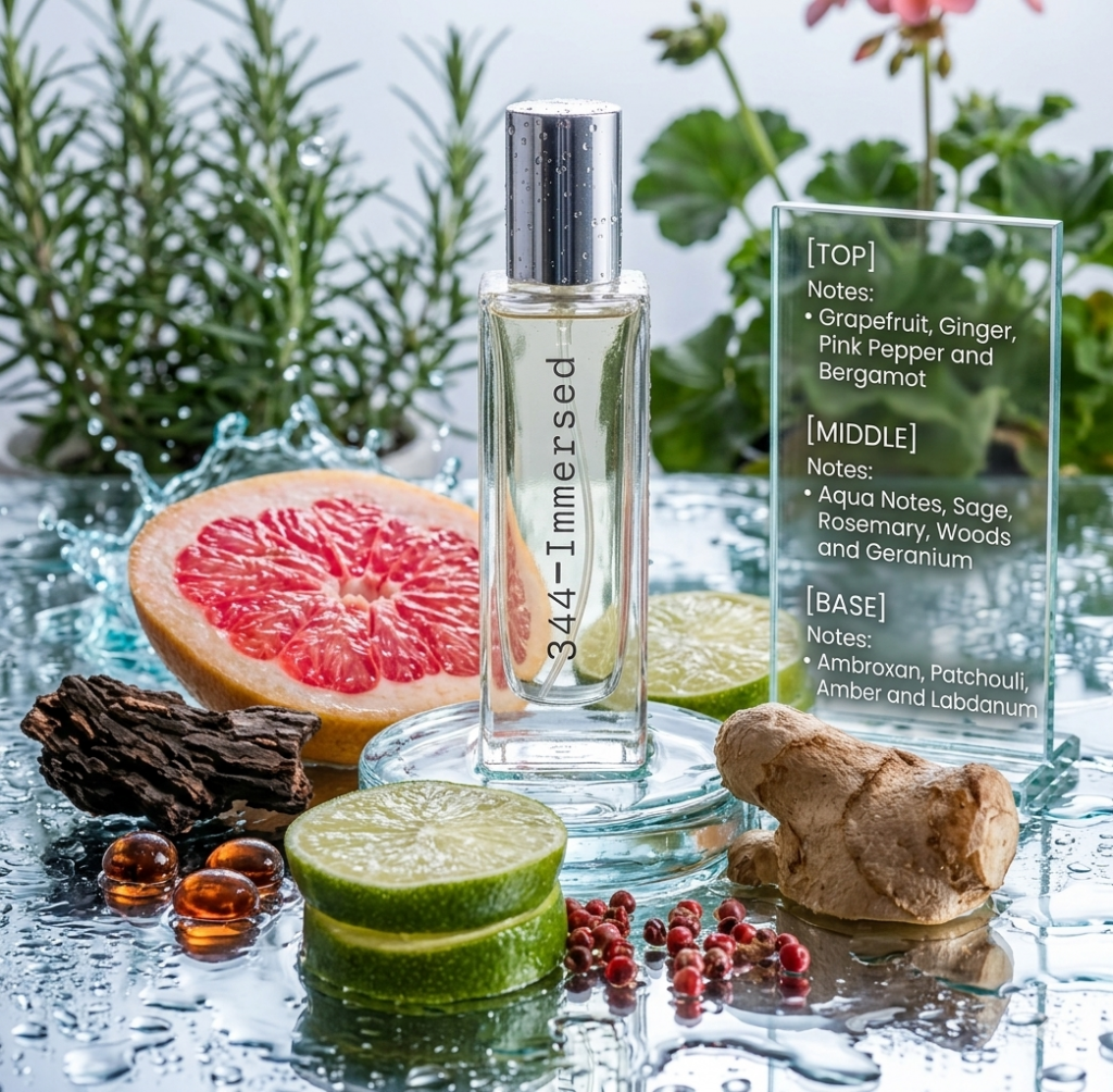 Immersed, a captivating fragrance that opens with a burst of citrusy freshness from grapefruit, bergamot, and a hint of spicy warmth from ginger and pink pepper. As you dive deeper, the middle notes of refreshing aqua, aromatic sage, rosemary, balanced woods, and floral geranium create a sensory symphony. The journey concludes with a rich and grounding base of ambroxan, earthy patchouli, warm amber, and the resinous touch of labdanum. Immersed is an olfactory exploration that evokes a harmonious blend of nature's elements, leaving you enveloped in a sophisticated and lingering allure.